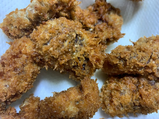そしてスライスして衣をつけて揚げる。衣付けからは娘も手伝ってくれました。